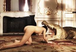 Helmuth Newton, Crocodile eating ballerina, from the Pina Bausch ballet Keushleitslegende, 1983
