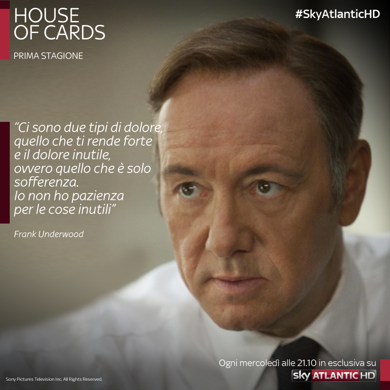 FRANK: [watching a dog that has been hit by a car] There are two kinds of pain. The sort of pain that makes you strong. Or useless pain. The sort of pain that’s only suffering. I have no patience for useless things. Moments like this require someone who will act. To do the unpleasant thing. The necessary thing… [puts the dog out of its misery] There, no more pain.