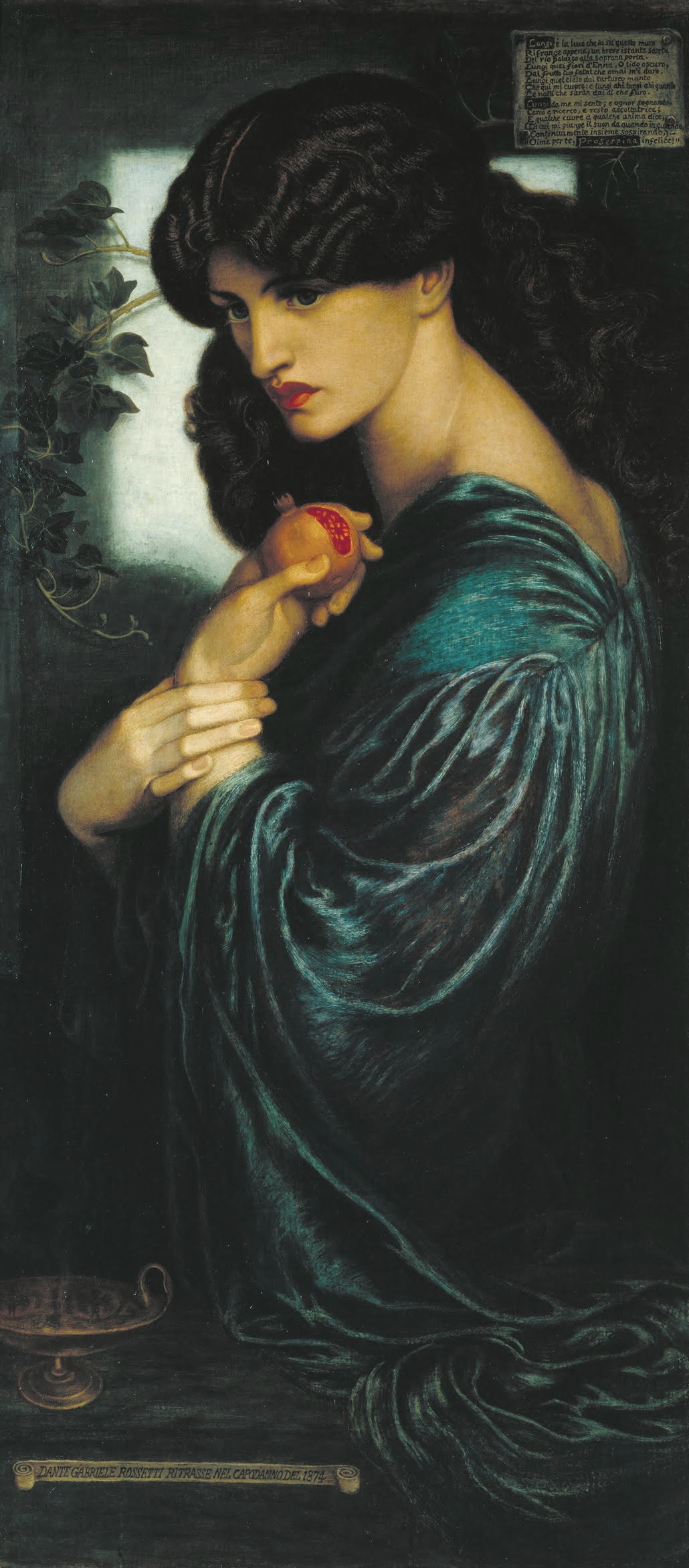 Various symbols contained in the painting include the pomegranate, which signifies captivity and marriage, and the incense-burner, the attribute of a goddess. The decorative quality of the picture is accentuated by the curve of the ivy spray, a symbol of clinging memory, which is echoed in Proserpine’s arm and the rich folds of drapery. The painting is inscribed with the artist’s signature and date on a scroll at lower left: ‘DANTE GABRIELE ROSSETTI RITRASSE NEL CAPODANNO DEL 1874’ (‘Dante Gabriel Rossetti painted this at the beginning of 1874’). Rossetti, who was also a poet, wrote a sonnet for the painting, inscribing it in Italian on the picture